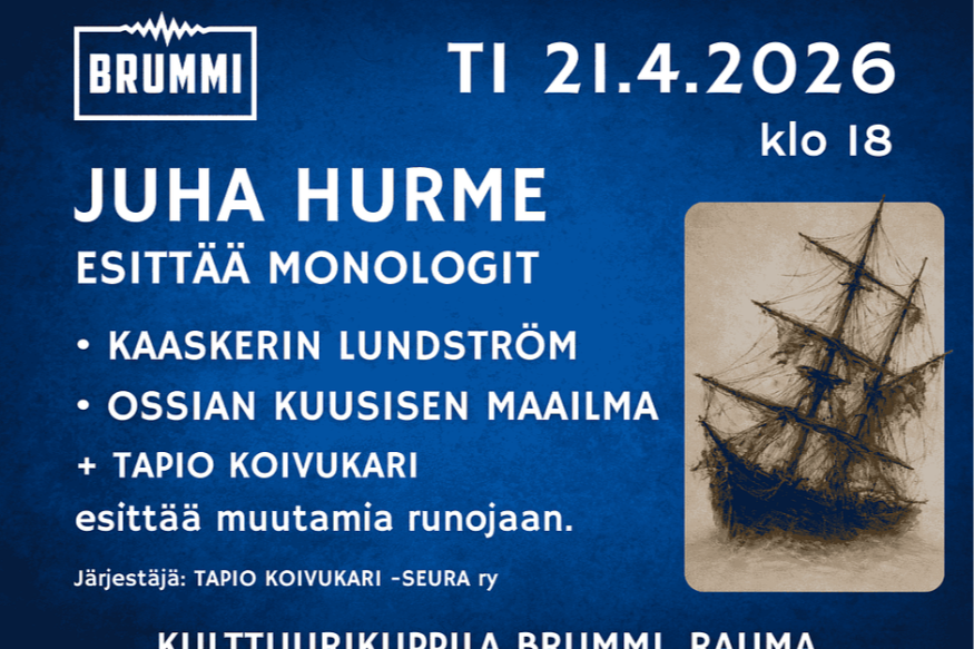 Tiistaina 21.4.2026 klo 18 alkaen Kulttuurikuppila BrummissaJuha Hurmeen monologiesitykset Ovet auki klo 17.Tilaisuus alkaa klo 18.Liput 30 €, sis. narikan.Nappaa tästä ostoskoriin.