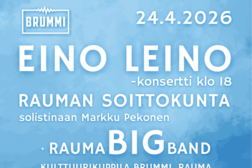 Eino Leinon juhlakonsertti 24.4.2026 klo 18Rauman Soittokunta solistinaan Markku Pekonen+ Konsertissa väliajan jälkeen: Rauma Big BandKonsertin kesto n. 2 h.Liput ovat tulossa myyntiin aivan pian...